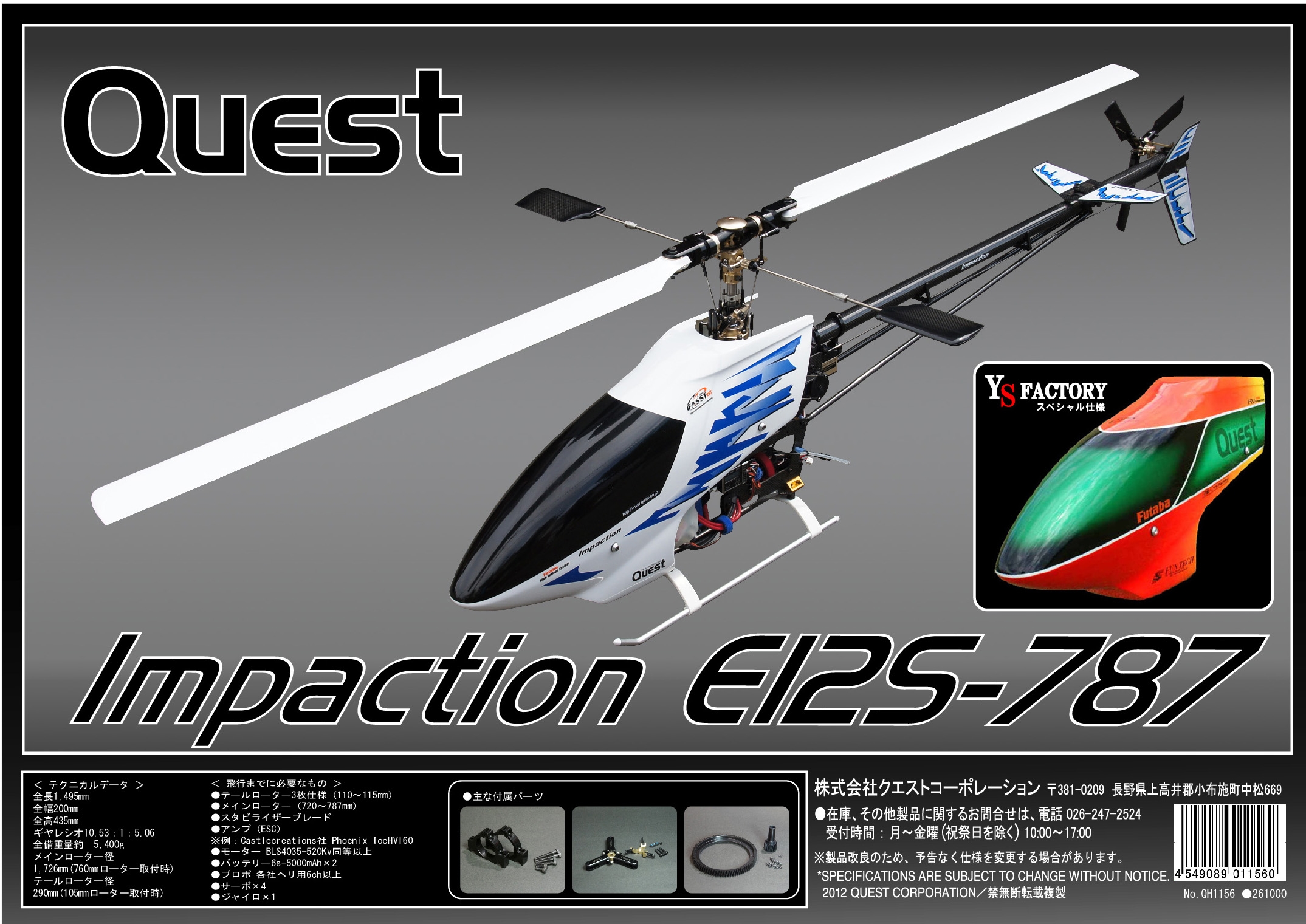 従来のインパクションE12S-720をよりハイパワーなMOTORを効率よく運動エネルギーに変換する為、 メインローターをルール上の最大限まで 長くする為のロング化(787mm長)に対応。 これにより、上空飛行時はハイスピードかつ等速感のある演技が容易に、且つオートローテーション時にも 余裕の浮力が体感できる。もちろん、好みにより700mmブレードを選択すれば、キビキビと切れの有る上空飛行も可能。 E12S-720からの主な仕様変更は下記の内容になります。 ダブルベアリングシーソーに変更 ヘッドダンパー50度→60度へ変更 スタビライザーバー500mm→530mmへ変更 メインローターのグリップ厚12→14mmに変更(12mm用カラーはOPになります) 軽量かつ高剛性のアルミ削りだしHGテールブームホルダーを採用。 HPテールグリップ 3ブレード (0°)により、テールの保持力強化している。 カーボンテールブーム 787mm用 カーボンリンケージロッド 787mm用 カーボンテールサポートパイプ680mm テールドライブベルト(2025) 787mm用 < 飛行までに必要なもの > テールローター(95~110mm)3Blade/推奨(B057FT・テールローター105(3枚)) メインローター(グリップ厚14mm)(700~787mm) スタビライザーブレード/推奨(FUNTECH 60,90パドル)※FBのみ Motor/推奨(クエストQP0028/BLS4730-520モーターと同等以上) アンプ(ESC)/LiPo12セル/160A以上(700~720mmは120A以上) バッテリー(別売)6s-5800mAh×2 プロポ(別売)各社ヘリ用6ch以上 サーボ×4 ジャイロ×1 |