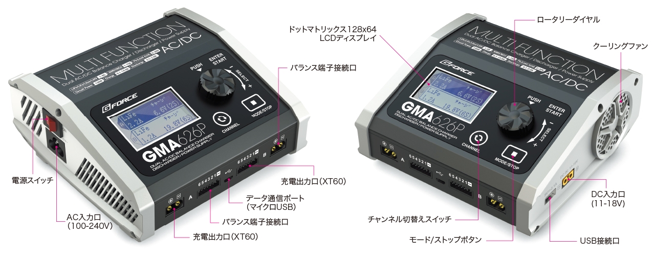 マルチファンクション デュアルAC/DC充電器。 最大130W/14Aを2系統同時出力可能なデュアルAC/DC充電器 異なる種類/容量のバッテリーを2本同時に充放電可能 パワーサプライ機能を搭載、最大25VのDC出力が可能 逆接保護回路、温度カットなど多くのセーフティ機能を搭載 日本語(カタカナ)表示でカンタン操作 別売の「BT-LINK」を使用して専用アプリから操作が可能 内容物 GMA626P AC/DC Charger本体 AC入力ケーブル 日本語取扱説明書 製品仕様 AC入力電圧 100-240V バランス調整電流 500mA/cell(最大値) DC入力電圧 11-18V セーフティタイマー 1-720分 OFF DC電源出力 5-25V/130W(×2系統) メモリー機能 最大10メモリー USB出力 5V/2.1A 対応バッテリー LiPo/LiIon/LiFe/LiHV:1-6cells NiMH/NiCd:1-15cell Pb:2-20V LCD表示 128x64 LCDディスプレイ 本体サイズ 160×150×71mm 充電電流 0.1-14.0A/130W(×2系統) 重量 896g 放電電流 0.1-2.0A/10W(×2系統) デルタピーク設定幅 NiMH/NiCD 3-15mV/cell |