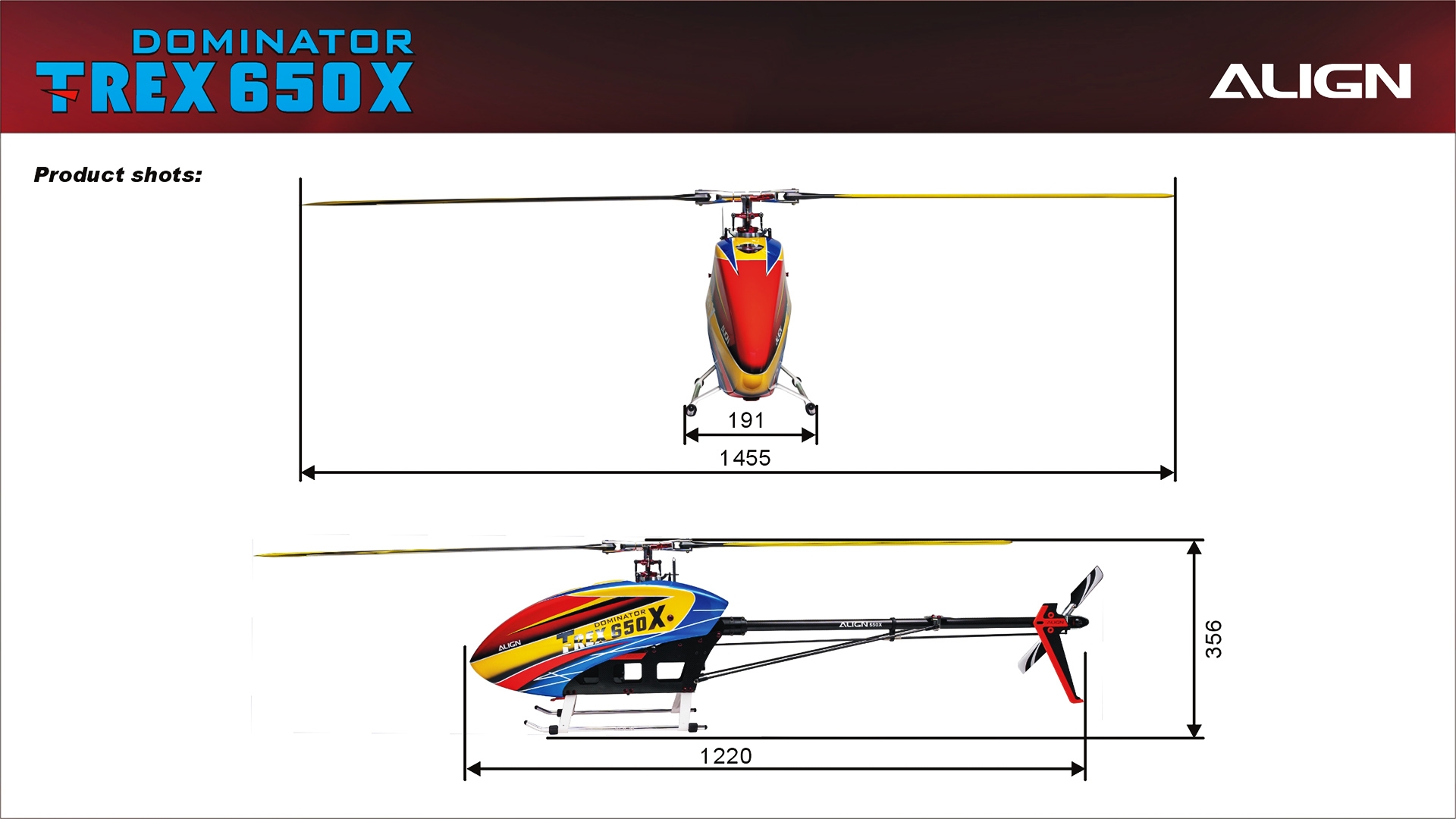 Specification ● Length: 1220mm ● Height: 356mm ● Width: 191mm ● Main Blade Length: 650mm ● Main Rotor Diameter: 1455mm ● Tail Rotor Diameter: 280mm ● Motor Pinion Gear: 16T ● Main Drive Gear: 112T ● Autorotation Tail Drive Gear: 131T ● Tail Drive Gear: 34T ● Drive Gear Ratio: 7:1:3.85 ● Takeoff Weight (w/o battery): 3320g Accessories ● T-REX 650X F3C DOMINATOR Set x 1set ● 650 Carbon Fiber Blades x 1set ● 105mm 3K Carbon Fiber Tail Blades x 1set ● 800MX Brushless Motor(720KV/4530) x 1 ● DS820M High Voltage Brushless Servo x 3 ● DS825M High Voltage Brushless Servo x 1 ● RCE-BL130A Brushless ESC x 1 ● Microbeast PLUS Flybarless System x 1 Radio transmitter and electronic equipment ● Transmitter(6-channel or more, helicopter system) ● Receiver(6-channel or more) ● 6S Li-Po 5200~6000mAh x 1 ● Digital Pitch Gauge |