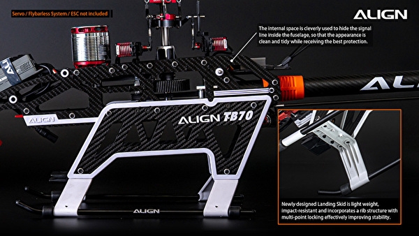 ●Length: 1356mm ●Height: 358mm ●Width: 187mm ●Main Blade Length: 650-730mm ●Main Rotor Diameter: 1542mm ●Tail Length: 105-115mm ●Tail Rotor Diameter: 279mm ●Motor Belt Pulley: 23T ●Belt Pulley: 50T ●Front Drive Main Shaft: 15T ●Main Drive Gear: 62T ●Autorotation Tail Drive Gear: 27T ●Tail Drive Gear: 23T ●Drive Gear Ratio: 8.96:1:4.83 ●Max RPM(approx.): 2290RPM ●Frame Weight: Approx. 2.3kg Accessories ●TB70 Kit Set x 1 set ●700 Carbon Fiber Blades x 1 set ●105mm 3K Carbon Fiber Tail Blades x 1 set ●850MX Brushless Motor(490KV/4535) x 1 |