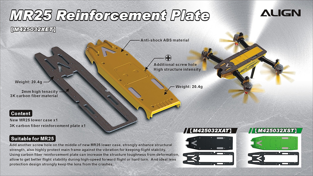 ●2ミリメートル、高靭3K炭素繊維材料。 ●新しいMR25下部ケースの中央に別のネジ穴を追加し、強く構造強度を高めるためには、また、高度飛行安定性を維持するための振動に対してメインフレームを保護します。炭素繊維補強板を使用することで、高速前進飛行またはハードターンの間に優れた飛行安定性を取得することができ、変形からの構造の靭性を向上させることができます。理想的なレンズの保護設計が強くクラッシュからレンズを守ります。 ●MR25保護ボード×1 ●MR25キャノピー-下限(ブラック)×1 ●ソケットスクリュー1×0 |