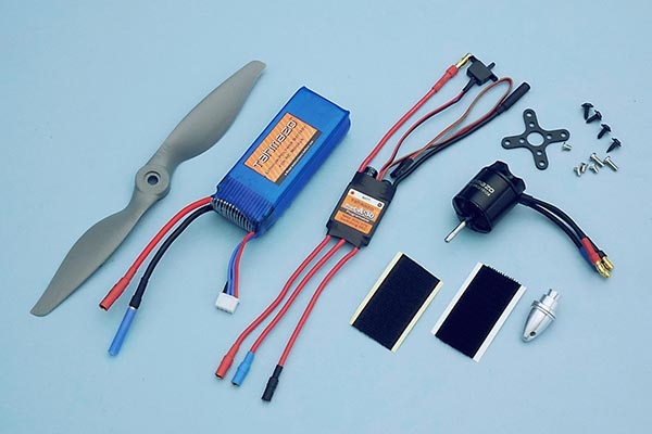 10~15クラスのエンジン機を電動化するために最適なパーツ一式をパックにしたものです。実際にフライトテストを行ったうえでエンジン機を飛ばしたときと同じフィーリングが得られるようにペラ、モーター、バッテリー、アンプの組合せを決定しています。