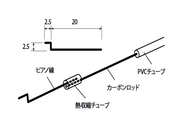 サーボに負担をかけずにダイレクトな操縦性を確保します。 100g未満の機体をサポートする「白サポ」商品 ロッドエンドには、 0.8mmピアノ線を使います。 商品内容 ・ 1mm カーボンロッド 長さ50cm 2本 ・ 2mm PVCチューブ 長さ50cm 2本 ・ 0.8mm L=120mm ピアノ線 1本 ・ 1.5mm L=60mm 熱収縮チューブ 1本 使用方法 (1)ピアノ線を図の様に曲げます。 (2)ピアノ線をホーンに刺し、ピアノ線とカーボンロッドを熱収縮チューブにと通します。 (3)ヒートガン等でチューブを縮めます。 (4)熱収縮チューブとピアノ線、カーボンロッドの隙間に瞬間接着剤低粘度1滴たらします。 |