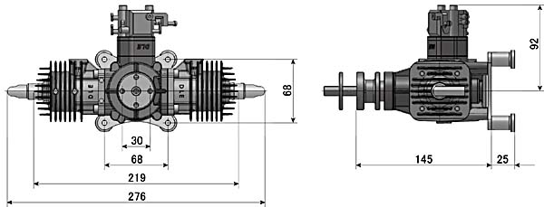 水平対向2気筒(ボクサーツイン)ゆえの振動の少なさに加え、DLEエンジンの伝統とも言える軽量、ハイパワーも兼ね備えています。もちろんガソリンエンジンの最大の特徴である燃費の良さと燃料価格の安さからもたらされるランニングコストの低さは言うまでもないことです。 更に、同程度のガソリン60ccの単気筒エンジンとかわらない価格で水平対向2気筒エンジンを手にすることが出来るのは大きな魅力です。 またこのモデルのCDI点火装置は動作電圧がリポ2セル、最大8.4VまでOKのハイボルテージ対応となっています。 主要規格; 排気量:61cc 水平対向2気筒 ボアxストローク:36mmx30mm 圧縮比:7.6:1 出力:7HP/8500rpm アイドリング:1400rpm 点火方式:CDI電子式(自動進角調整機能付) CDIユニット動作電圧:4.8V~8.4V 使用燃料:2サイクル用混合ガソリン 適合プロペラ:22x10、23x8、23x10 重量:本体 1560g 排気管 170g CDI点火ユニット(#2) 190g ※(仕様は断り無く変更する場合があります) |