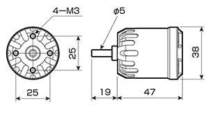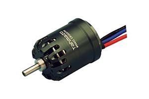 ローターが中に入っているインナーローター形式の様に見えますが、実はこれがアウターローター形式のブラシレスモーターで、一番外側に見えるケースは回転しません。 フロントケースで機体に取り付ける形式でありながらリード線は後ろから出ています。 飛行機の胴体の中でアウターローターがむき出しで回転しませんので配線や他のメカの配置を気にしなくても良くなります。 型式:14極アウターローターブラシレスモーター Wクラス:600W KV: 1050 外径:38mm、全長47mm(本体のみ) 軸径 4.0mm 重量 154g リポ2セル~3セル対応 当社テスト参考値:RL12x6カーボン折ペラ、電流 44A、回転数 9640rpm、推力 2100g リポ TahmazoLP-3S1P4400SR ESC Tahmazo Pro.C-A50 |