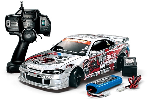 日産のモータースポーツを担当するニスモが仕上げたドリフト仕様車、ニスモ COPPERMIX シルビアを1/10スケールで再現した完成電動ラジオコントロールカーです。名前のようにドリフト走行が手軽に楽しめるのが魅力。スタイリッシュなフォルムをリアルに再現したボディはポリカーボネート製。派手なマーキングは貼り込み済み。さらに、高輝度LEDを標準装備してライトの点灯が可能です。もちろん、車体も組み立て済み、ホイールタイプの送信機、走行用バッテリー、充電器もセットされ、すぐに走りが楽しめます。