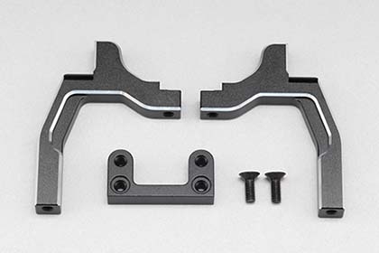 YD-2EX用に標準で使われているアルミ製フロントバルクヘッドです。サイドブリッジを使わずにアッパーデッキと直接コネクトすることで、メインシャーシのロールを引き出し、フロント部の引っ掛かりを抑える構造になっています。装着方法の違いだけなので、YD-2シリーズに共通で使用することが可能です。メインのバルクヘッドパーツは面取り加工を施し、ルックスも引き立てます。