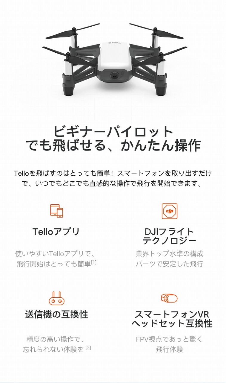 セット内容 トイドローン Tello Tello用バッテリー×3本 Telloバッテリー充電ハブ Tello用USB充電ケーブル スペアプロペラ×2ペア |