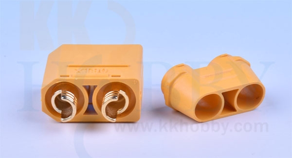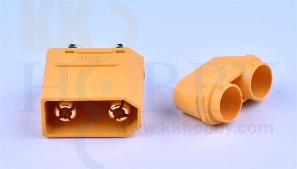 接触面積の広い4.5mmタイプのコネクターが内部に入っており、耐熱性のある樹脂で出来ているため連続90A、瞬間最大120A(メーカー公称値)までの高電流に耐えるコネクターです。 8AWGまでのシリコンケーブルが取り付け可能です。 XT60コネクターの上位サイズになります。