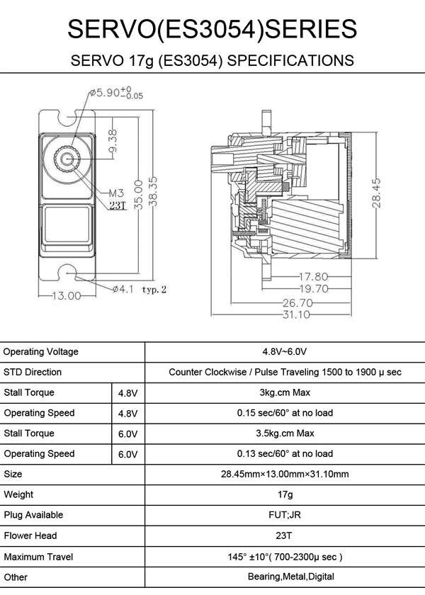 ミドルクラスでも小さめになりますのでミニサーボでは若干弱いかなと思うようなところの利用に最適です。 デジタルサーボなので動作分解能が高く、ベアリング入りで動きもスムーズ、ニュートラル性も良いです。 同クラスのES3154に比べてトルクが0.5kgアップして3kg(4.8V時)になりましたので、25クラスの機体にも利用可能です。 【 スペック 】 サイズ:約28mm×約12.8mm×約27mm 重量:約20.0g コネクター長:240mm コネクタータイプ:ツメなしコネクター(フタバ、JRともにOK) |