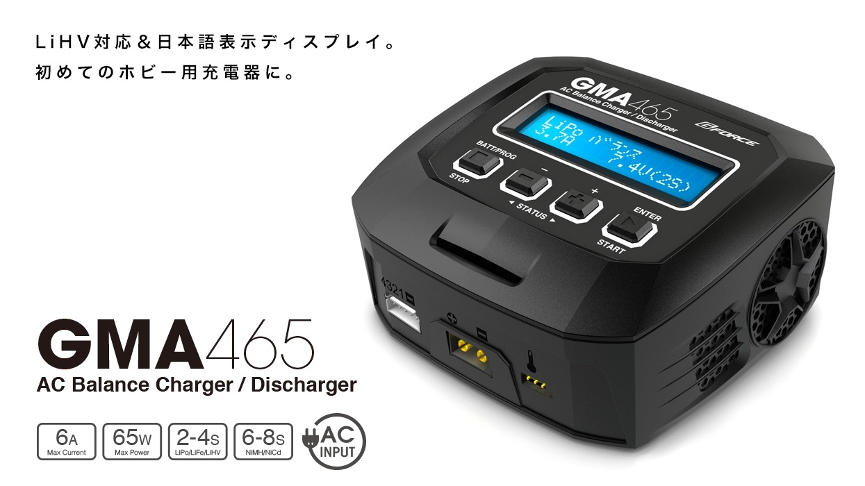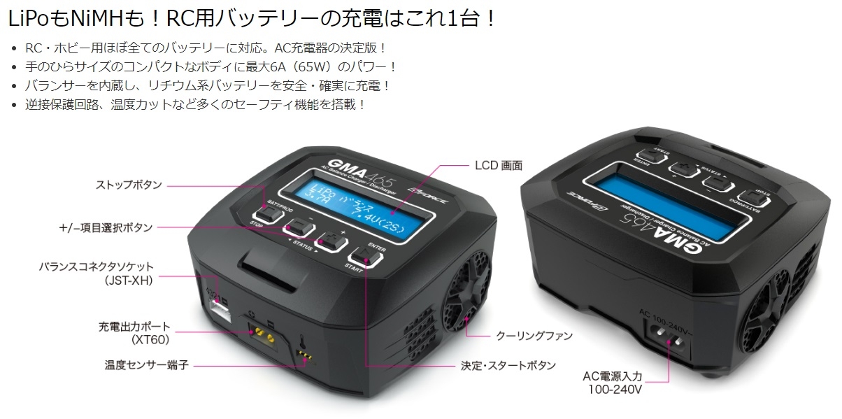 追加でRCX09-555 XT30-XT60コネクターを使えば U200、マイクロ空撮機バッテリーが充電出来ます。 LiPoもNiMHも!RC用バッテリーの充電はこれ1台! RC・ホビー用ほぼ全てのバッテリーに対応。AC充電器の決定版! 手のひらサイズのコンパクトなボディに最大6A(65W)のパワー! バランサーを内蔵し、リチウム系バッテリーを安全・確実に充電! 逆接保護回路、温度カットなど多くのセーフティ機能を搭載! 製品仕様 入力電圧 AC100-240V バランス調整電流 300mA/Cell(最大値) 操作部 4ボタン セーフティタイマー 1-120分,OFF LCD表示 2行×16文字 ブルーバックライト 対応バッテリー NiMH/NiCD 6-8Cells LiPo/LiFe/LiHV/LiIon 2-4S PB 3-6Cells 本体サイズ 118×115×45(mm) 重量 315g 充電電流 0.1-6.0A(最大65W) デルタピーク設定幅 NiMH/NiCD 3-15mV/cell 放電電流 0.1-2.0A(10W) カット温度設定範囲 20-80℃ メモリー機能 最大10メモリー 内容物 GMA465 AC Charger本体 AC入力ケーブル タミヤタイプ コネクタ 日本語取扱説明書 |