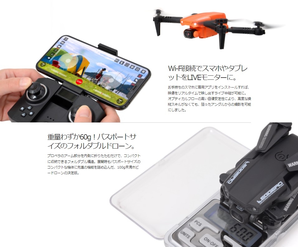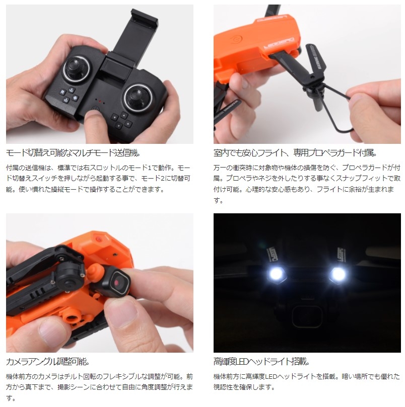 専用ケース付き超小型フォルダブルドローン。 前方から真下まで角度調整可能な、4K/2K高画質カメラを搭載 ビジョンセンサによるオプティカルフローポジショニング機能を搭載 自動高度維持機能搭載! 離陸も着陸もワンキー操作のイージーオペレーション Wi-Fi通信でスマホとリンク、LIVEビューやスマホならではの操縦が可能 専用アプリで映像を確認しながら動画&写真撮影(iOS&Android対応) 重量わずか60gの超軽量フォルダブルドローン ヘッドライトに超高輝度LEDを2灯搭載 MODE1⇔MODE2切替え可能な2.4GHz送信機付属(技適マーク取得済) |