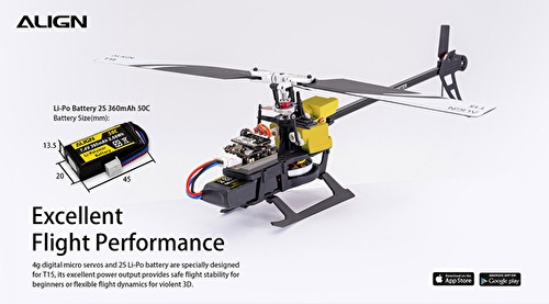 ● Length: 272mm ● Height: 85mm ● Main Blade Length: 120mm ● Main Rotor Diameter: 280mm ● Tail Rotor Diameter: 51mm ● Full Weight(Without Battery): about 100g Accessories ●T15 Kit x 1 ●T15 Main Blades x 1 set ●T15 Tail Blades x 1 set ●15M Main Motor(1500KV/2405) x 1 ●15MT Tail Motor(8000KV/1103) x 1 ●T15 Digital Servo x 2 ●T15T Digital Servo x 1 ●Remote Extension x 1 ●Li-Po Battery 2S 360mAh 50C(45x20x13.5mm) x 1 ●T15 Carry Box x 1 ●1.3mm Hexagon screw driver(Blue/8.2g) x 1 ●0.9mm Hexagon screw driver(Red/8g) x 1 ●Feathering Shaft Wrench x 1 ●Parts box x 1 |