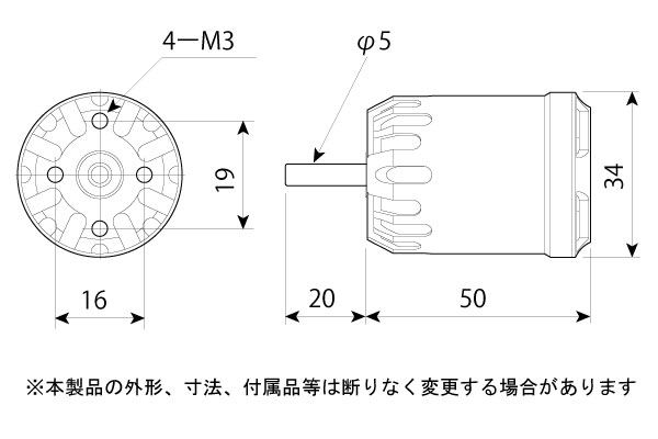 ・型式 : 14極アウターローターブラシレスモーター ・Wクラス : 900W ・ KV : 1250rpm/V ・外径 : 34mm ・全長 : 50mm(本体のみ) ・軸径 : 5.0mm ・重量 : 142g ・適合電圧 : 10~16V(リポ3セル~4セル相当) 参考データ(測定データは使用機材、外気温などにより大きく変動します) 電流 56A、回転数 12840rpm、推力 2800g (外気温度23度) (使用機材) RL11x8カーボン折ペラ リポ 4セル ESC Tahmazo Pro.C-A60 (注)データは使用機材、気温等により大きく変動します。 |