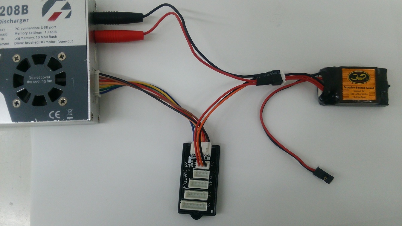 機体に搭載したLiPo2S受信機バッテリーのメインコネクターを外さずに,バランスコネクターから充電する事が出来ます。 充電器側コネクターは4mmバナナプラグ、バランスコネクターはJST-XH 2セルタイプとなります。 |