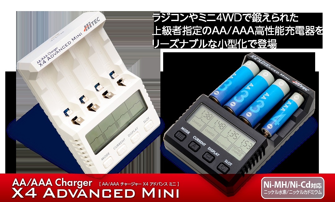 充電器では世界最高峰の技術レベルを誇るHitecのノウハウをすべて投入! クラス初、電池のパンチ力が見える内部抵抗測定機能を装備、電池の真の実力が分かります。 お手持ちの電池の実力を極限まで引出し、走りを変えます! 単3・単4形 充電池4本同時充・放電 AAとAAAバッテリーを同時にハイレベル充電放電 CHARGE(充電) 充電する電池の容量にあった電流値を選択して充電を行います DISCHARGE(放電) 過放電を防止し限界の0.9Vまで放電を行います 電池のリフレッシュ機能でダレた電池を復活させます REFRESH(リフレッシュ) バッテリー残量を全て放電してから充電を行い本来の性能を引き出す機能 クラス初、電池の内部抵抗機能でパンチ力(mΩ)が測定できます mΩ(ミリオーム) 電池が劣化するほど内部抵抗が大きな値となり、走行した時に電圧は低下します。内部抵抗の数値を確認でき電池の状態を確認できます。 電源はUSB5V-2.1Aをご使用できます USB コンパクトで持ち運びに便利なUSB電源接続ケーブル(30cm)は屋内・屋外にかかわらず使用可能 セット内容 ※ X4 Advanced Mini 本体 USB電源接続ケーブル 日本語説明書 ※すべて税抜表記をしております。※ 充電池・USB電源アダプタは含まれておりません。 ※製品の仕様・外観・価格などは製品改良のため、予告なく変更になる場合がありますのでご了承下さい。 基本仕様 対応充電池 単3・単4型 Ni-MH/Ni-Cd 充電池 スロット 4スロット装備 入力電源 5V 2.1A 使用 動作モード 充電、放電、サイクルリフレッシュ、電池内部抵抗計測 LCD表示 電圧、容量、電流、電池内部抵抗、時間 充電電流 200mA / 500mA / 700mA / 1000mA / 1500mA 放電電流 100mA / 250mA / 350mA / 500mA / 650mA 電池許容範囲 最大 3000mAh トリクル充電 50mA サイズ 108 × 73 × 28 mm 重量 106 g |