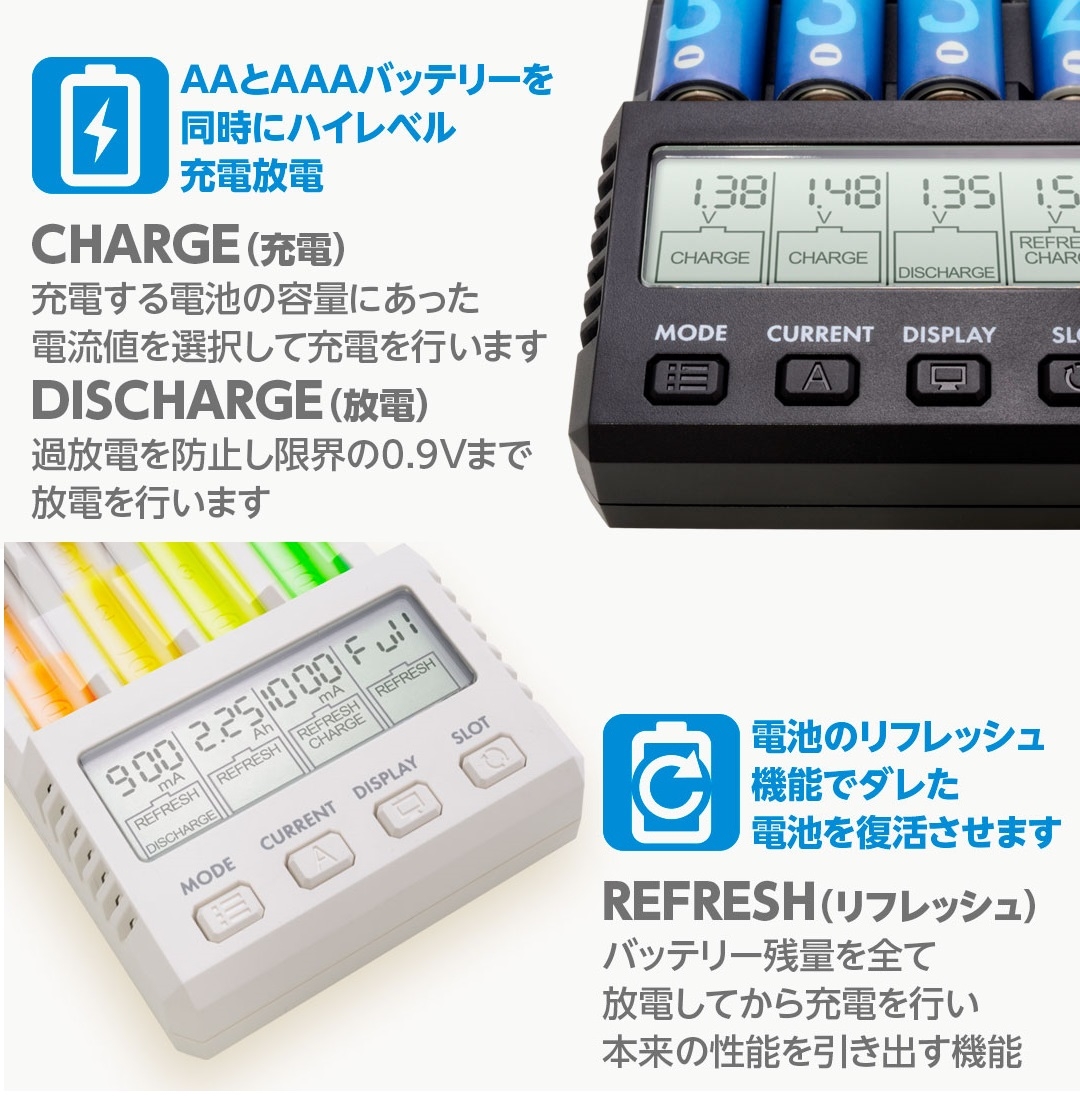 充電器では世界最高峰の技術レベルを誇るHitecのノウハウをすべて投入! クラス初、電池のパンチ力が見える内部抵抗測定機能を装備、電池の真の実力が分かります。 お手持ちの電池の実力を極限まで引出し、走りを変えます! 単3・単4形 充電池4本同時充・放電 AAとAAAバッテリーを同時にハイレベル充電放電 CHARGE(充電) 充電する電池の容量にあった電流値を選択して充電を行います DISCHARGE(放電) 過放電を防止し限界の0.9Vまで放電を行います 電池のリフレッシュ機能でダレた電池を復活させます REFRESH(リフレッシュ) バッテリー残量を全て放電してから充電を行い本来の性能を引き出す機能 クラス初、電池の内部抵抗機能でパンチ力(mΩ)が測定できます mΩ(ミリオーム) 電池が劣化するほど内部抵抗が大きな値となり、走行した時に電圧は低下します。内部抵抗の数値を確認でき電池の状態を確認できます。 電源はUSB5V-2.1Aをご使用できます USB コンパクトで持ち運びに便利なUSB電源接続ケーブル(30cm)は屋内・屋外にかかわらず使用可能 セット内容 ※ X4 Advanced Mini 本体 USB電源接続ケーブル 日本語説明書 ※すべて税抜表記をしております。※ 充電池・USB電源アダプタは含まれておりません。 ※製品の仕様・外観・価格などは製品改良のため、予告なく変更になる場合がありますのでご了承下さい。 基本仕様 対応充電池 単3・単4型 Ni-MH/Ni-Cd 充電池 スロット 4スロット装備 入力電源 5V 2.1A 使用 動作モード 充電、放電、サイクルリフレッシュ、電池内部抵抗計測 LCD表示 電圧、容量、電流、電池内部抵抗、時間 充電電流 200mA / 500mA / 700mA / 1000mA / 1500mA 放電電流 100mA / 250mA / 350mA / 500mA / 650mA 電池許容範囲 最大 3000mAh トリクル充電 50mA サイズ 108 × 73 × 28 mm 重量 106 g |