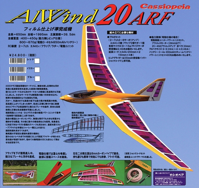 全長:650mm 全幅=1995mm 主翼面積=39.5dm 全備重量:400~450g(動力無しピュア仕様) 600~670g(電動3-4セル850mAhバッテリー) RC装置 2-7ch エルロン/フラップ/ラダー/電動ユニット 2000クラス競技用機をターゲットに、無駄を排し圧倒的な浮き 性能と低速安定性を追求した結果の無尾翼構造。 弱くなったサーマルから次のサーマルへの移動に高速飛行も可能 にしました。小さなサーマルでも無尾翼の鋭い方向性を生かし 戦車の信地旋回のような旋回も可能。 万が一、失速させても高度の低下も最小限が無尾翼の特徴。 高高度に上がってしまった時や、定点に正確に降ろす為に装備 されたフラップは低速飛行と強力なブレーキを操作、安全な高度 処理と正確な定点着陸を可能としました。 推奨電動ユニットはひとクラス小型の軽量パワーユニットで素早 <短時間で高高度に上昇できます。 独自の構造とカーボンカンザシ、無理な飛行でも大きな荷重から 機体を守る構造、その他に数々の新技術などを採用。気象変化 に対応できるバラスト搭載のスペースも充分あり、速度を競うスロ ープフライトは半端なシャーレー機以上の走りと 旋回性能を見せてくれます。 無尾翼の不安定な要素を通常の機体と 変わらないレベルまでの性能に仕上げ競技フライヤーが唸らせた 高性能が実感できます。初めての無尾翼の方にも安心して飛ば せる安定性です。 組み立てに必要な機材 プロポセット (2-7ch2-6サーボ1アンプ) エルロン2個 フラップ2個ラダー1個 各舵マイクロ(9-15g)サイズサーボ 受信機は2.4Gをお勧めいたします。 延長コード(エルロン250mm×2 150mm×4本) ピュアグライダーは350mAh受信機バッテリー ショックコードで上昇可能。 ●動力関係(電動仕様の場合) 電動推奨ユニット:パワーユニットセット。 ブラシレスモーター(28mm以下) 25~40Aブラシレスアンプ折ペラ(30mm) プロペラサイズ:9-5(3セル)〜8-4.5(4セル) バッテリー:3~4s-850mAhリチュームバッテリー パワーユニットセット400をお勧めめいたします。 |