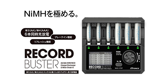 最大2.5Aの大電流充電と画期的な3ステップチャージモード。 単三/単四型バッテリーを思うがままに、自由自在に充放電。 単三/単四充電池を最大6本同時に充放電可能 充電、放電、リフレッシュ、ブレークインの4つの動作モードを搭載 3段階で充電設定可能な「STEP CHARGE MODE」を搭載 最大充電電流2.5A!放電電流1.5A!パワフル充放電器 日本語(カタカナ)表示で操作カンタン モーターブレークイン(最大6.0V)機能搭載 USB機器の電源に使えるUSB(QC3.0)出力搭載 バッテリー内部抵抗測定機能搭載 逆接続防止機能搭載 内容物 充電器本体 専用ACアダプター 取扱説明書 本体仕様 入力電源 DC12V/3A USB(QC3.0)出力5V/3A, 9V/2A(最大18W) 対応バッテリー NiMH/NiCD デルタピーク設定幅 1-8mV バッテリーサイズ 単三(AA)/単四(AAA) トリクル充電電流 30-99mA/OFF 充電電流 0.1-2.5A カット温度設定範囲 55-65℃ 放電電流 0.1-1.5A 重量 600g 放電カット電圧範囲 0.8V-1.0V サイズ 148x135x65mm |