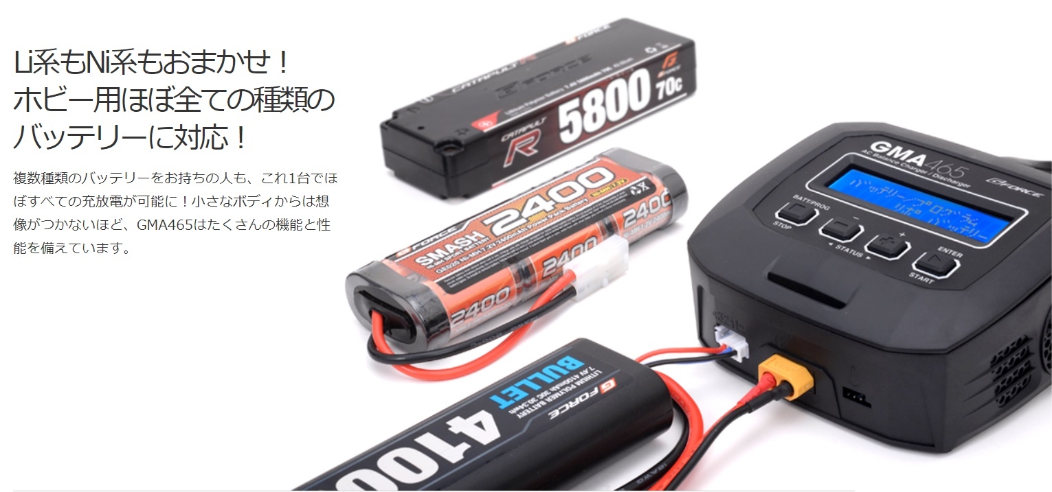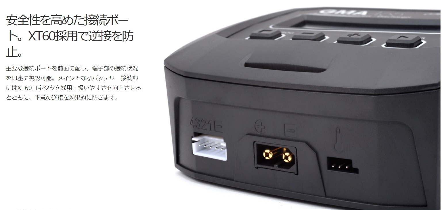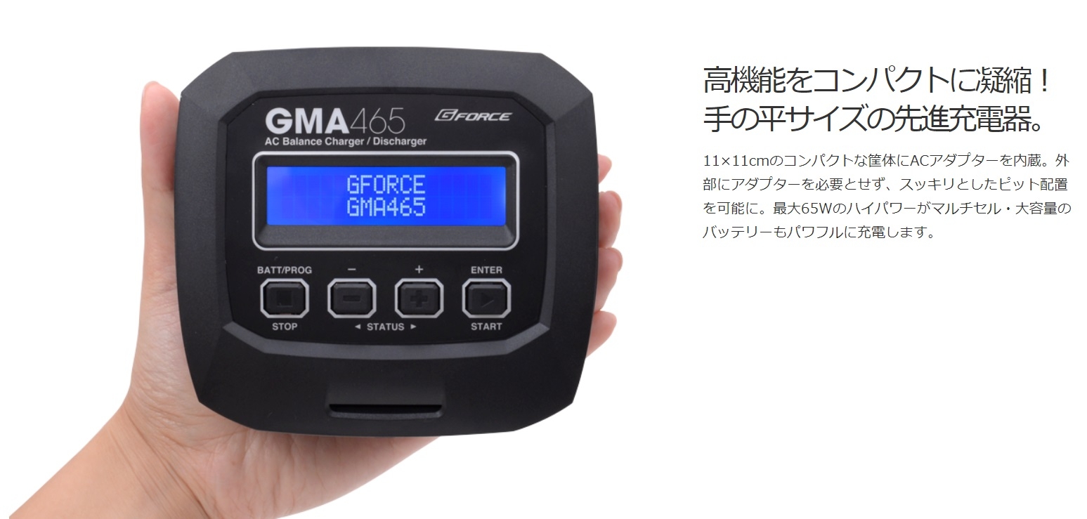 追加でRCX09-555 XT30-XT60コネクターを使えば U200、マイクロ空撮機バッテリーが充電出来ます。 LiPoもNiMHも!RC用バッテリーの充電はこれ1台! RC・ホビー用ほぼ全てのバッテリーに対応。AC充電器の決定版! 手のひらサイズのコンパクトなボディに最大6A(65W)のパワー! バランサーを内蔵し、リチウム系バッテリーを安全・確実に充電! 逆接保護回路、温度カットなど多くのセーフティ機能を搭載! 製品仕様 入力電圧 AC100-240V バランス調整電流 300mA/Cell(最大値) 操作部 4ボタン セーフティタイマー 1-120分,OFF LCD表示 2行×16文字 ブルーバックライト 対応バッテリー NiMH/NiCD 6-8Cells LiPo/LiFe/LiHV/LiIon 2-4S PB 3-6Cells 本体サイズ 118×115×45(mm) 重量 315g 充電電流 0.1-6.0A(最大65W) デルタピーク設定幅 NiMH/NiCD 3-15mV/cell 放電電流 0.1-2.0A(10W) カット温度設定範囲 20-80℃ メモリー機能 最大10メモリー 内容物 GMA465 AC Charger本体 AC入力ケーブル タミヤタイプ コネクタ 日本語取扱説明書 |