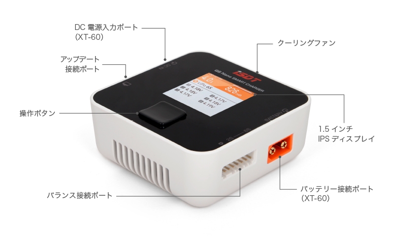 200Wのパワーを7×7cmサイズに! 常識破りの超小型スマート充電器。 最大200W/8Aのパワーを7×7cmのコンパクトボディに凝縮 日本語表示機能(※出荷時は英語表示。切替え操作が必要です) 片手で全ての操作が可能なワンボタン・オペレーション 高コントラストで視認性に優れたIPS液晶パネルを採用 温度検知式クーリングファンを内蔵し効率的に内部を冷却 安定化電源として使えるDC電源モードを搭載(2-30V/0.2-5A) バッテリーの廃棄に便利な破壊(Destoroy)モードを搭載 内容物 Q6 Nano 充電器本体 取扱説明書 ※電源接続用ケーブル、充電用変換ケーブルは別途ご用意下さい 。 製品仕様 入力電圧 DC10〜30V 対応セル数 1〜6S(LiFe,Po,Ion,LiHV)、 1〜16S(NiMH,Cd)、1〜12S(PB) 充電電流 0.2〜8.0A 放電電流 0.2〜1.0A ディスプレイ 1.5インチ(240*240) IPS液晶 充電出力 200W 操作可能温度 0〜40℃ 放電出力 10W 保管時温度 -20〜60℃ バランス電流 0.5A/Cell サイズ 72×72×32mm 対応バッテリー LiFe,LiPo,LiIon,LiHV,NMH,NiCd,PB 重量 120g |