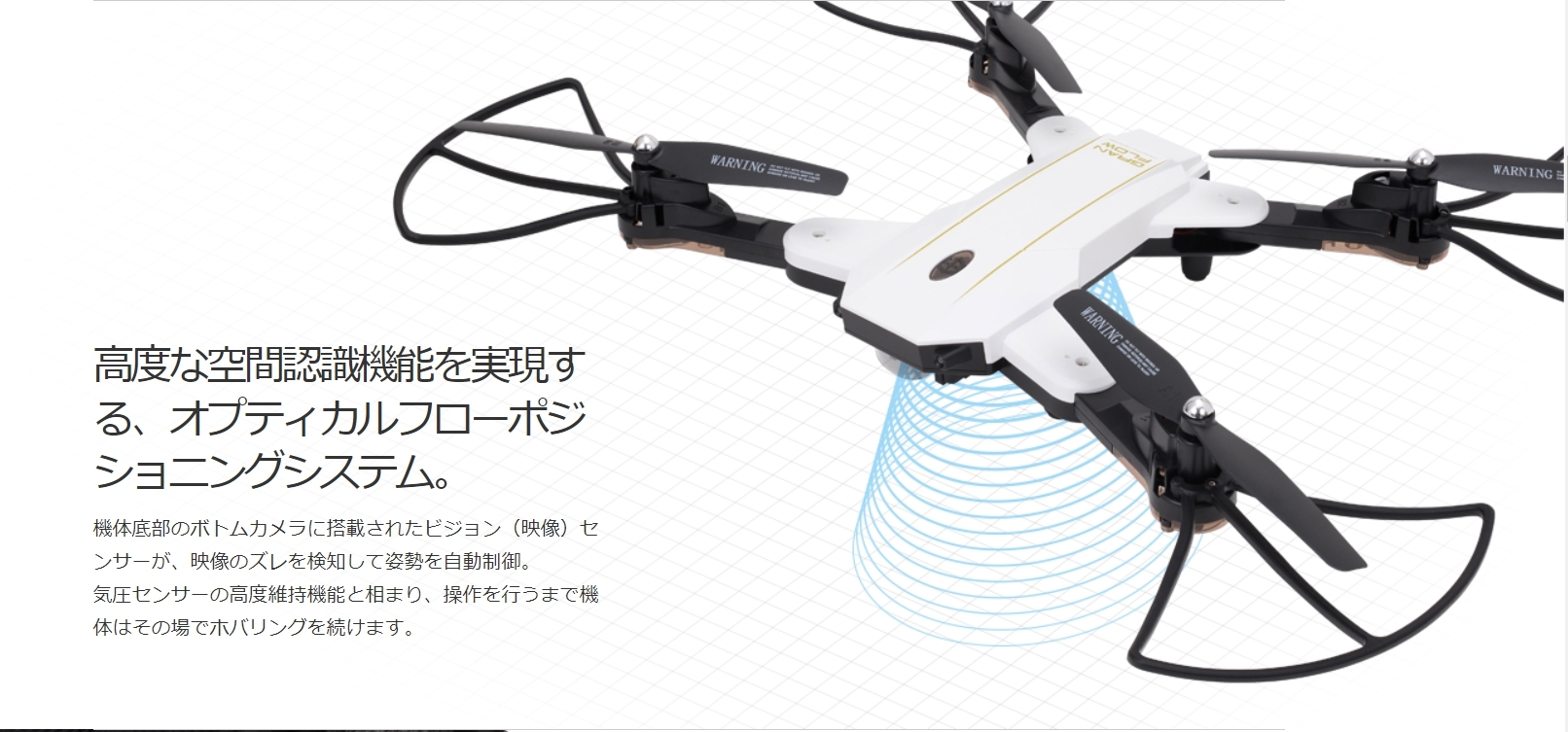 前方と底部に2つのカメラを備えたデュアルカメラ搭載機 バードビューと真俯瞰のアングルをワンタッチで切替え可能 ビジョン(映像)センサーによるオプティカルフローポジショニングを実現 持ち運びに便利な専用キャリングケースが付属 MODE1⇔MODE2切替え可能な2.4GHz送信機付属(技適マーク取得済) 自動高度維持機能搭載! 離陸も着陸もワンキー操作のイージーオペレーション Wi-Fi通信でスマホとリンク、LIVEビューやスマホならでは操縦が可能に 専用アプリで映像を確認しながら動画&写真撮影(iOS&Android対応) 1300mAh大容量バッテリーを搭載、11〜12分のフライトが可能 モーター交換が容易なコネクタ接続方式 |