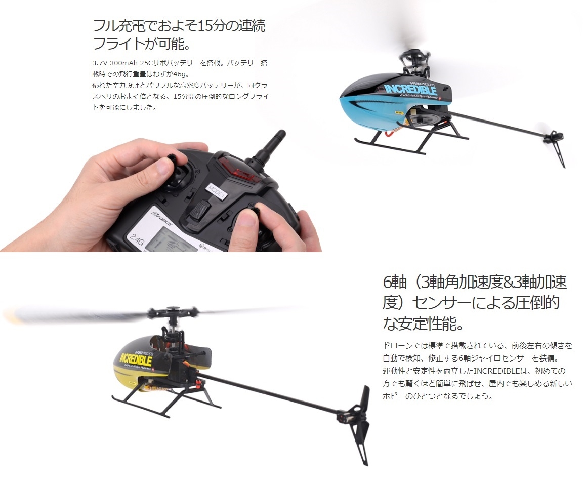 およそ15分のロングフライトを実現。 最適の空力設計により、連続15分の超ロングフライトを実現 スタイリッシュなスタビレス構造で、優れた運動性能を実現 6軸(3軸角加速度&3軸加速度)センサーによる圧倒的な安定性能 2通りのスピード感が楽しめる、デュアルレート機能を搭載 安定したパワーと耐久性に優れた8520メインモーターを採用 柔軟性のある素材を使用、多少の衝突でも壊れにくい高耐久設計 液晶ディスプレイ搭載2.4GHz 4ch送信機付き(技適マーク取得済) シンプルで組立てしやすいパーツ構成でパーツ交換もラクラク 破損時の修理、パーツ交換も安心! スペアパーツをフルラインナップ 別売りの「Futaba互換モジュール(GB148)」を使用する事で、S-FHSS方式のFutaba送信機でフライトが可能 |