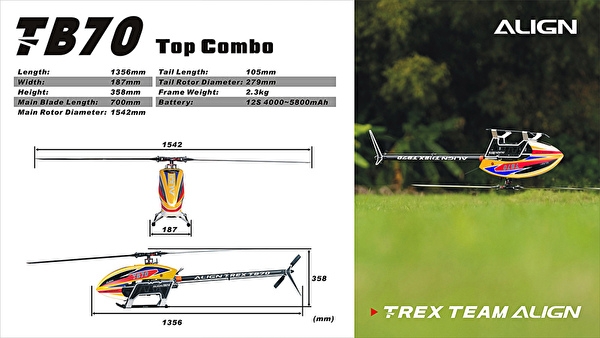 ●Length: 1356mm ●Height: 358mm ●Width: 187mm ●Main Blade Length: 650-730mm ●Main Rotor Diameter: 1542mm ●Tail Length: 105-115mm ●Tail Rotor Diameter: 279mm ●Motor Belt Pulley: 23T Belt Pulley: 50T ●Front Drive Main Shaft: 15T ●Main Drive Gear: 62T ●Autorotation Tail Drive Gear: 28T ●Tail Drive Gear: 23T ●Drive Gear Ratio: 8.96:1:5.0 ●Max RPM(approx.): 2290RPM ●Frame Weight: Approx. 2.3kg ●Flying Weight(With Battery): Approx. 4.9kg (ALIGN 12S 5200mAh) Accessories ●TB70 Kit Set x 1 set ●700 Carbon Fiber Blades x 1 set ●105mm 3K Carbon Fiber Tail Blades x 1 set ●850MX Brushless Motor(490KV/4535) x 1 ●DS820M High Voltage Brushless Servo x 3 ●DS825M High Voltage Brushless Servo x 1 ●RCE-BL130A Brushless ESC x 1 ●Microbeast PLUS Flybarless system x 1 |