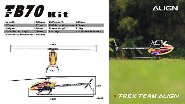 ●Length: 1356mm ●Height: 358mm ●Width: 187mm ●Main Blade Length: 650-730mm ●Main Rotor Diameter: 1542mm ●Tail Length: 105-115mm ●Tail Rotor Diameter: 279mm ●Motor Belt Pulley: 23T ●Belt Pulley: 50T ●Front Drive Main Shaft: 15T ●Main Drive Gear: 62T ●Autorotation Tail Drive Gear: 27T ●Tail Drive Gear: 23T ●Drive Gear Ratio: 8.96:1:4.83 ●Max RPM(approx.): 2290RPM ●Frame Weight: Approx. 2.3kg Accessories ●TB70 Kit Set x 1 set ●700 Carbon Fiber Blades x 1 set ●105mm 3K Carbon Fiber Tail Blades x 1 set ●850MX Brushless Motor(490KV/4535) x 1 |