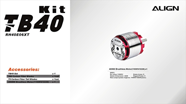 ●Length: 747mm ●Height: 223mm ●Width: 103mm ●Main Blade Length: 380mm ●Main Rotor Diameter: 851mm ●Tail Length: 70mm ●Tail Rotor Diameter: 188mm ●400MX Brushless Motor(1100KV/3220) ●Motor Belt Pulley: 22T ●Drive Gear Ratio: 6.44:1:4.04 ●Max RPM(approx.): 3400RPM ●Frame Weight(Batteries not included): Approx. 953g Accessories ●TB40 Kit Set x 1 set ●380 Carbon Fiber Blades x 1 set ●70 Carbon Fiber Tail Blades x 1 set ●400MX Brushless Motor(1100KV/3220) x 1 |
