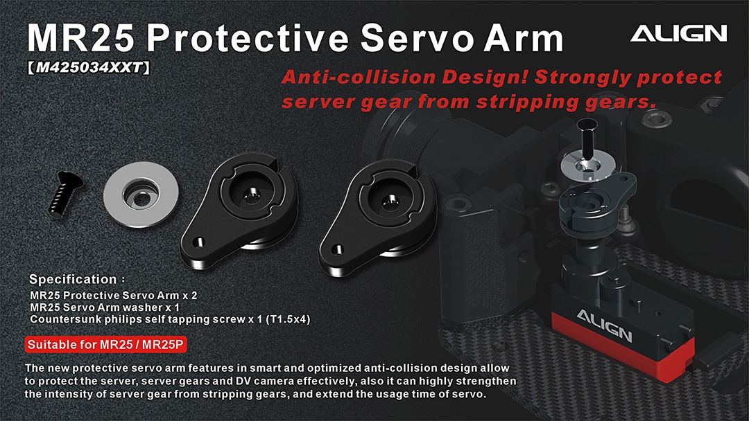 ●アンチコリジョンデザインの新しいサーボアームは、サーボにかかる過大な力を逃がし、サーボのギア欠けを防ぎ、効果的にサーボ、サーボギアとDVカメラを保護し、サーボの使用時間を延長します。