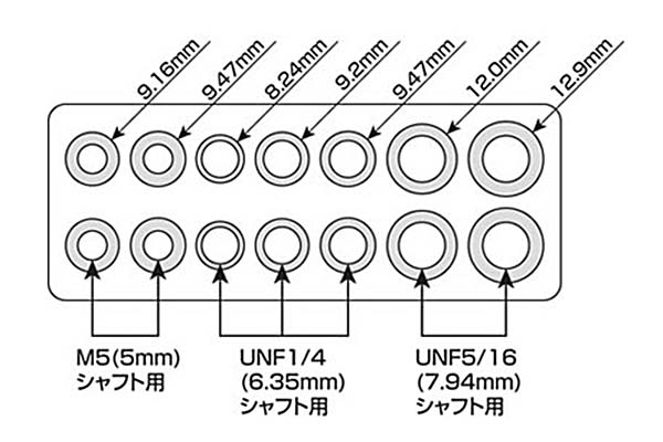 APCプロペラは高圧インジェクション成型されています。樹脂の入り口がハブの中心にあるために成型後ハブの中心にドリルで穴を開けています。ほとんどのエンジンのシャフト径に合うように穴が開けられていますが、サイズによってはエンジンのシャフト径よりも大きな穴が開いている場合があります。そのような場合このプロペラスペーサーを挿入することにより正確にエンジンシャフトの直径とハブ穴の直径を合わせることが出来ます。 ほとんどのエンジンのシャフト径に合うように3種類のシャフト穴径を準備しました。(M5、UNF1/4、UNF5/16) プロペラハブ穴径には数種類のサイズがあります。下記寸法図を参考にして、プロペラとエンジンシャフト径に合ったプロペラスペーサーをお使い下さい。必要ならばプロペラスペーサーの大きさを修正して下さい。 |