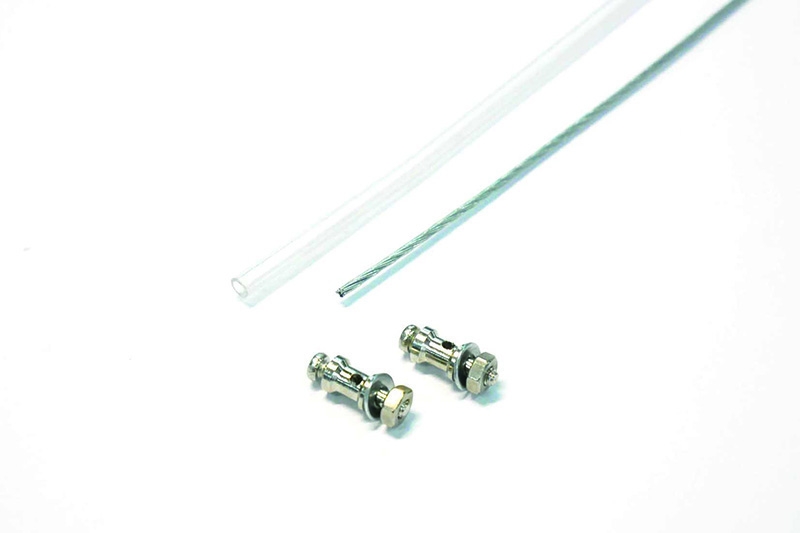 外径3.0mmの塩ビパイプに直径1.2mmのステンレスワイヤ(ヨリ線)、アジャスタブルストッパーを2個をセットしたリンケージセットです。