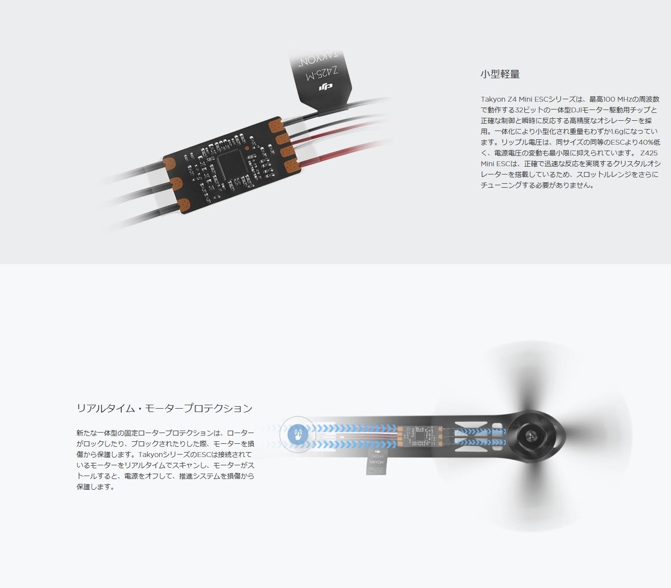 カスタマイズされたシステム・オン・チップ(SOC)とモジュール式回路が、高効率、高性能なモーター制御アルゴリズムと連動することで、 DJI TakyonシリーズESCはより高速で精密になりました。DJI Assistant 2は、直感的に操作でき、広範囲のパラメーターを設定して、 パフォーマンスを最適化できます。また、ファームウェアのアップデートも簡単にできます。 小型軽量 Takyon Z4 Mini ESCシリーズは、最高100 MHzの周波数で動作する32ビットの一体型DJIモーター駆動用チップと正確な制御と瞬時に反応する高精度なオシレーターを採用。 一体化により小型化され重量もわずか1.6gになっています。リップル電圧は、同サイズの同等のESCより40%低く、電源電圧の変動も最小限に抑えられています。 3Dモード Z4 Mini シリーズの3Dモードでは、瞬時にモーターの回転方向を変更できます。 これにより、速度と方向を維持しながら反転するなど他の方法では不可能だった操作が可能になりました。 スロットルの反応が早く、思いのままに操縦できます。 最大限の互換性を確保 内蔵の磁束観測技術や自己制御技術により、Z4 Mini ESCは、レース用で使用される高速KVモーターを始めとした 幅広い方形波駆動ブラシレスモーターを手動の調整なしに使用できます。また、ESCは最大500Hzの高速スロットル周波数や、 レース用ドローンの性能をさらに向上できようにOneShot125にも対応しています。 効率的なアクティブブレーキ・コントロール TakyonシリーズのESCはアクティブブレーキキングモードをサポート。Takyon搭載の機体は飛行中、迅速にブレーキングが可能で 敏捷かつ正確に操作できるため、パワーロスが減少し、効率性が向上します。 リアルタイム・モータープロテクション 新たな一体型の固定ロータープロテクションは、ローターがロックしたり、ブロックされたりした際、モーターを損傷から保護します。 TakyonシリーズのESCは接続されているモーターをリアルタイムでスキャンし、モーターがストールすると、 電源をオフして、推進システムを損傷から保護します。 簡単な設定と調整 DJI Assistant 2は、機体をどのように飛行させるかを簡単にカスタマイズできます。あらゆるニーズに合わせて、アクセル、タイミング、アクティブブレーキング、 スロットルレンジ、PWM周波数を設定し、レース用ドローンを素早く簡単にチューンナップ可能。 また、DJI Assistant 2は新しい機能と互換性を実現するファームウエアアップデートにも使用します。 |