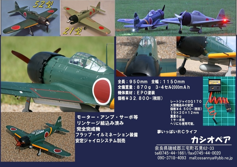 主翼面積:19.8dm 全備重量:870g(バッテリー除く) 推奨バッテリー: 3-4 セル2200mAh/Lipo モーター・アンプ・サーボ・ライトシステム・引込脚 各リンケージ済。ジャイロ搭載推奨 機体素材:EPO塗装 別途必要なパーツ 送信機・受信機(飛行機用7チャンネル以上) バッテリー:3セル2000~2500mAhリポ 延長コード:約50mm4本 ラッカースプレー(プロペラ・スピンナーを塗装) 安定ジャイロG170 G170リモート安定ジャイロ(別売) 小型機「ゼロ戦」のエルロンに装備 する事により、2.5mクラス機並み いく に安定性を増します。 ローカルスケール競技会で大型機に 負けないフライトを行い観客を驚か せたシステムです。 この製品は模型飛行機を製作、飛行する経験のある方向きに製作さ れたキットです。全く未経験の方がこのキットを製作、飛行されると、 重大な事故や火災となります。 飛行性能は安定したフライトと曲技性能を持ってますが、これは経験 者が操縦した場合で未経験者のフライトは機体を操縦できず重大事 故に繋がります。 未経験者の方がフライトされる場合は、経験者の指導の下で入門向 けの機体で訓練を終えてから本機のフライトに挑んで下さい。 |