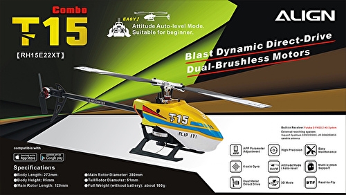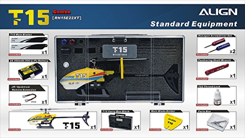 ● Length: 272mm ● Height: 85mm ● Main Blade Length: 120mm ● Main Rotor Diameter: 280mm ● Tail Rotor Diameter: 51mm ● Full Weight(Without Battery): about 100g Accessories ●T15 Kit x 1 ●T15 Main Blades x 1 set ●T15 Tail Blades x 1 set ●15M Main Motor(1500KV/2405) x 1 ●15MT Tail Motor(8000KV/1103) x 1 ●T15 Digital Servo x 2 ●T15T Digital Servo x 1 ●Remote Extension x 1 ●Li-Po Battery 2S 360mAh 50C(45x20x13.5mm) x 1 ●T15 Carry Box x 1 ●1.3mm Hexagon screw driver(Blue/8.2g) x 1 ●0.9mm Hexagon screw driver(Red/8g) x 1 ●Feathering Shaft Wrench x 1 ●Parts box x 1 |