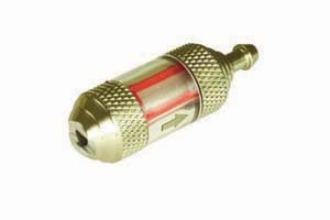 給油ポンプのガソリン缶側チューブの先端に取り付けるフィルターおもりで、燃料フィルターと同じ仕組みの交換式フィルターエレメントを使用しています。エンジンを調子よく運転するためには、このフィルター付きおもりと機体に取り付けたフィルターで二重にごみを除去してください。こちらも石油系燃料専用のため、グロー燃料には使用できません。