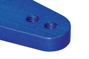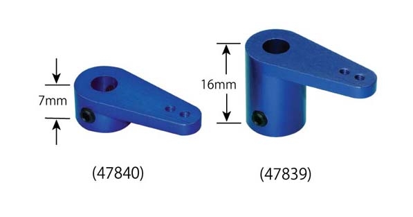 DLEエンジンなどに使用出来るアルミ製のスロットルアーム。 キャブレターに取りつける足の部分が高いタイプ(高さ16mm)と短いショートタイプ(高さ7mm)の2種類がある。 足の長さ(高さ)が異なるので、スロットルに通常タイプ、チョークバルブにショートタイプという具合に使い分ければキャブレターからの高さを違えることが出来るのでお互いのコントロールロッドが干渉することが無い。 材質はアルミ削り出しでアルマイト加工済。 コントロールロッド取付孔はホーン取付孔中心から14mmと17mmの2カ所に開けてあり、ボールリンクなどの取付に便利なように予めM2のタップが切ってある。 固定は両サイドからイモネジ2本でしっかり止めることが出来る。 |