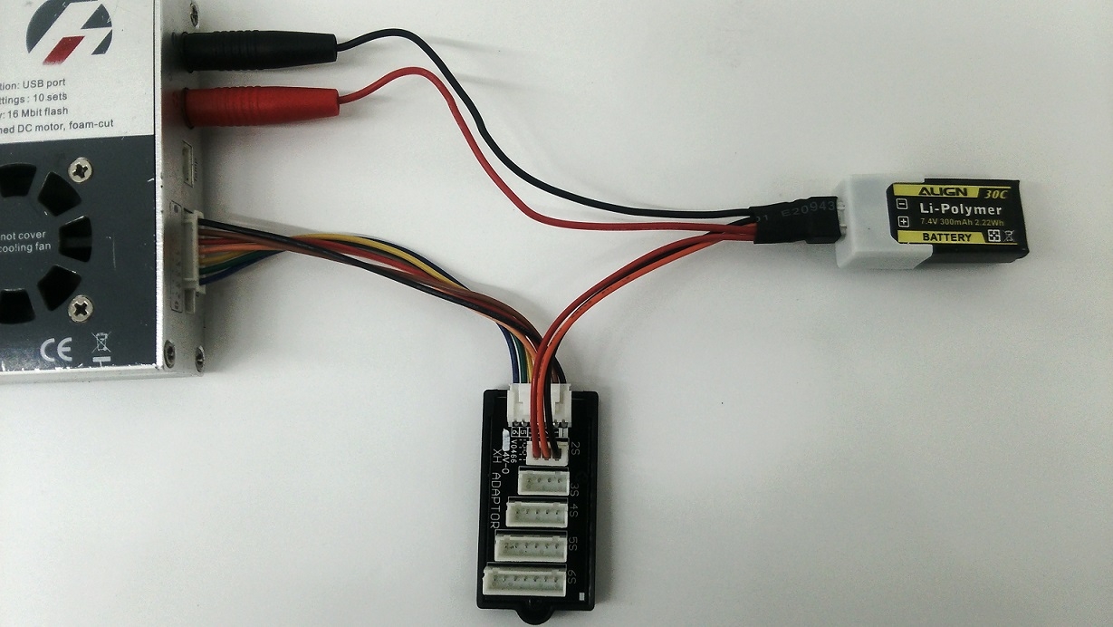 機体に搭載したLiPo2S受信機バッテリーのメインコネクターを外さずに,バランスコネクターから充電する事が出来ます。 充電器側コネクターは4mmバナナプラグ、バランスコネクターはJST-XH 2セルタイプとなります。 |