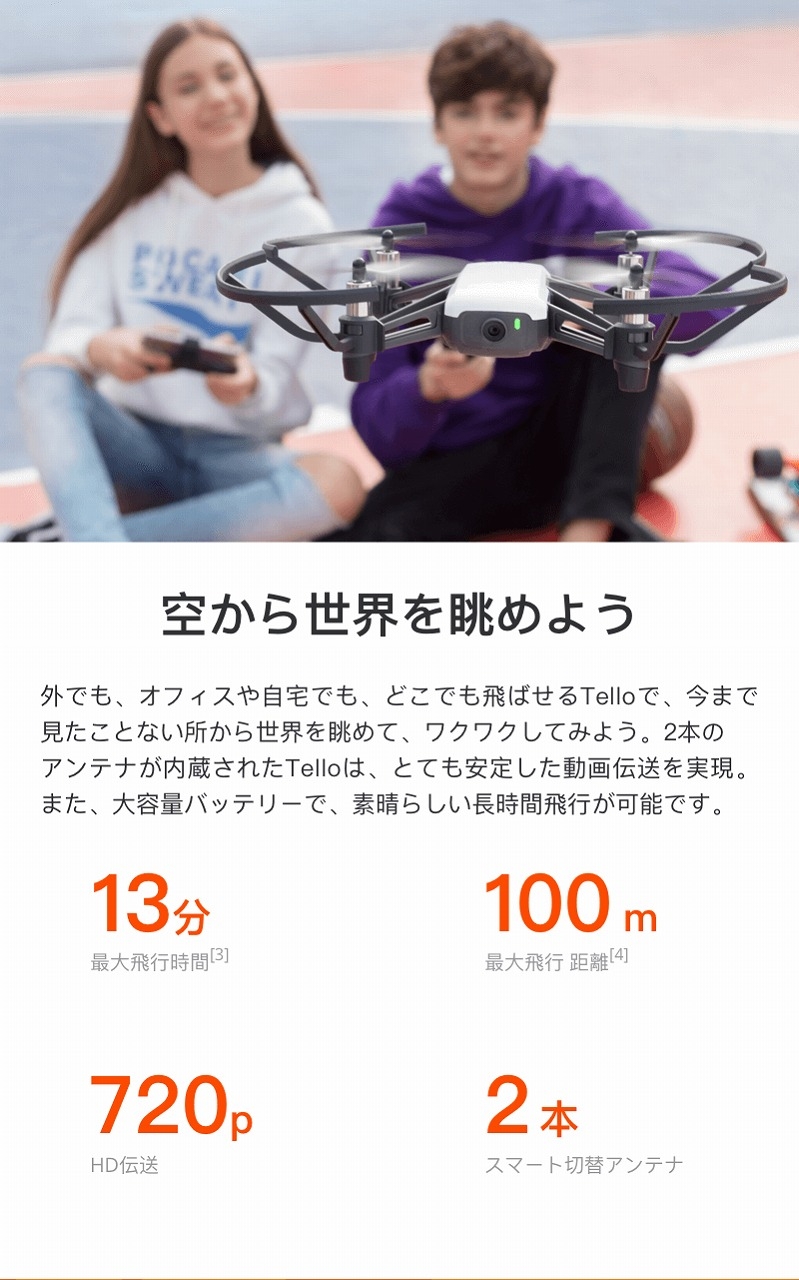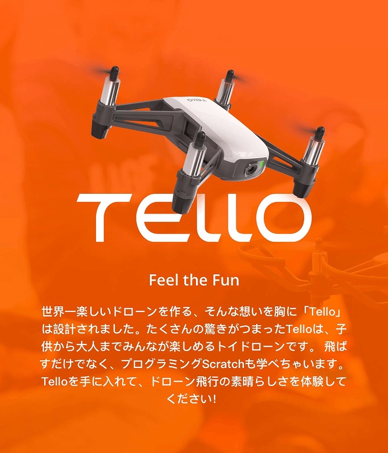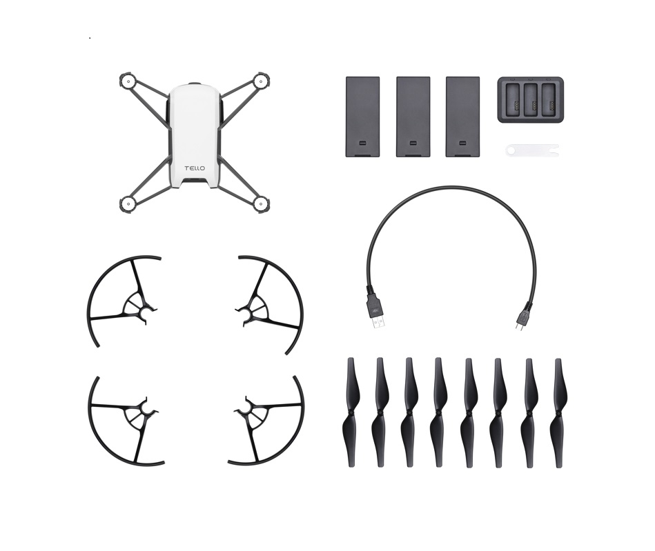 セット内容 トイドローン Tello Tello用バッテリー×3本 Telloバッテリー充電ハブ Tello用USB充電ケーブル スペアプロペラ×2ペア |